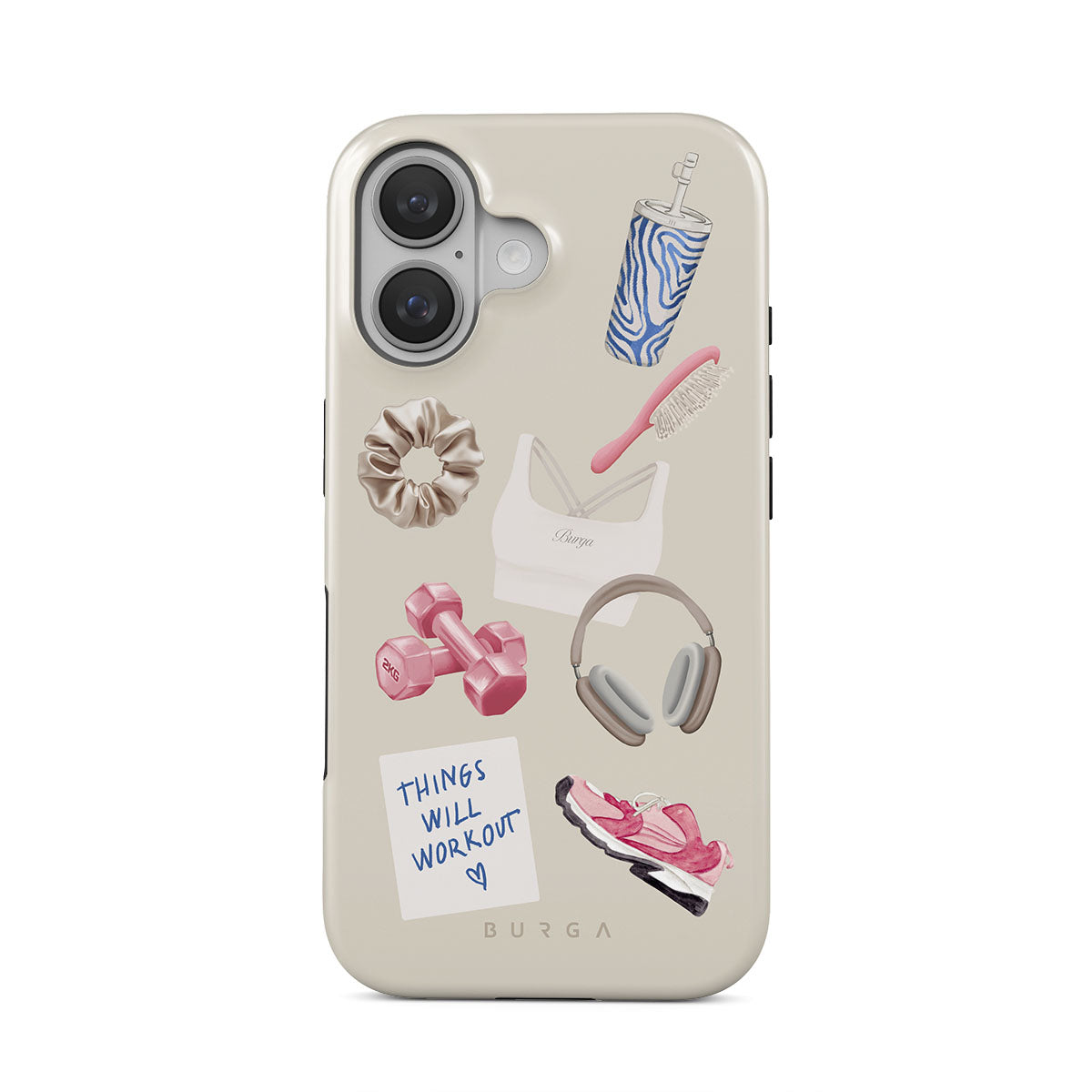 This design features: dumbbells, headphones, tumbler, hairbrush, pink trainers, sports bra, crunchie, "Things Will Work Out" sticky note