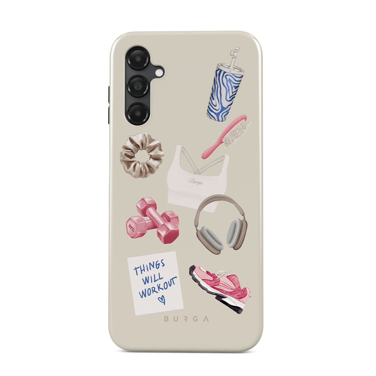 This design features: dumbbells, headphones, tumbler, hairbrush, pink trainers, sports bra, crunchie, "Things Will Work Out" sticky note