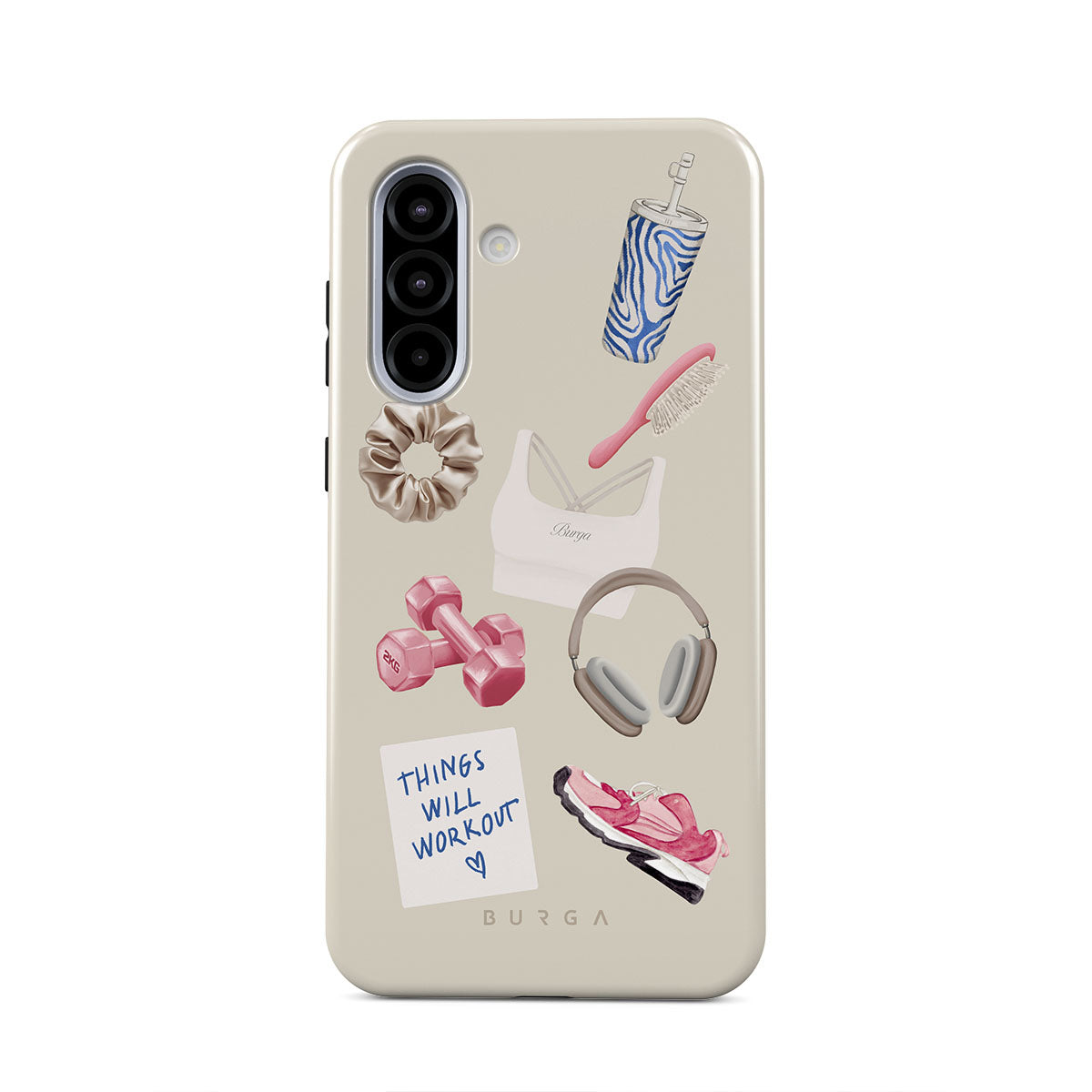 This design features: dumbbells, headphones, tumbler, hairbrush, pink trainers, sports bra, crunchie, "Things Will Work Out" sticky note