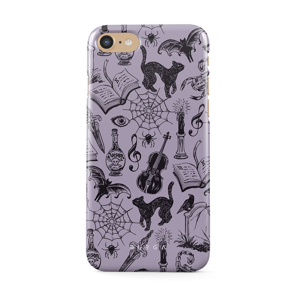 This design features: gothic doodles, mystical elements, spiders, spiderweb, cat, violin, eye, candle, dagger, book, bat, crow, scorpion