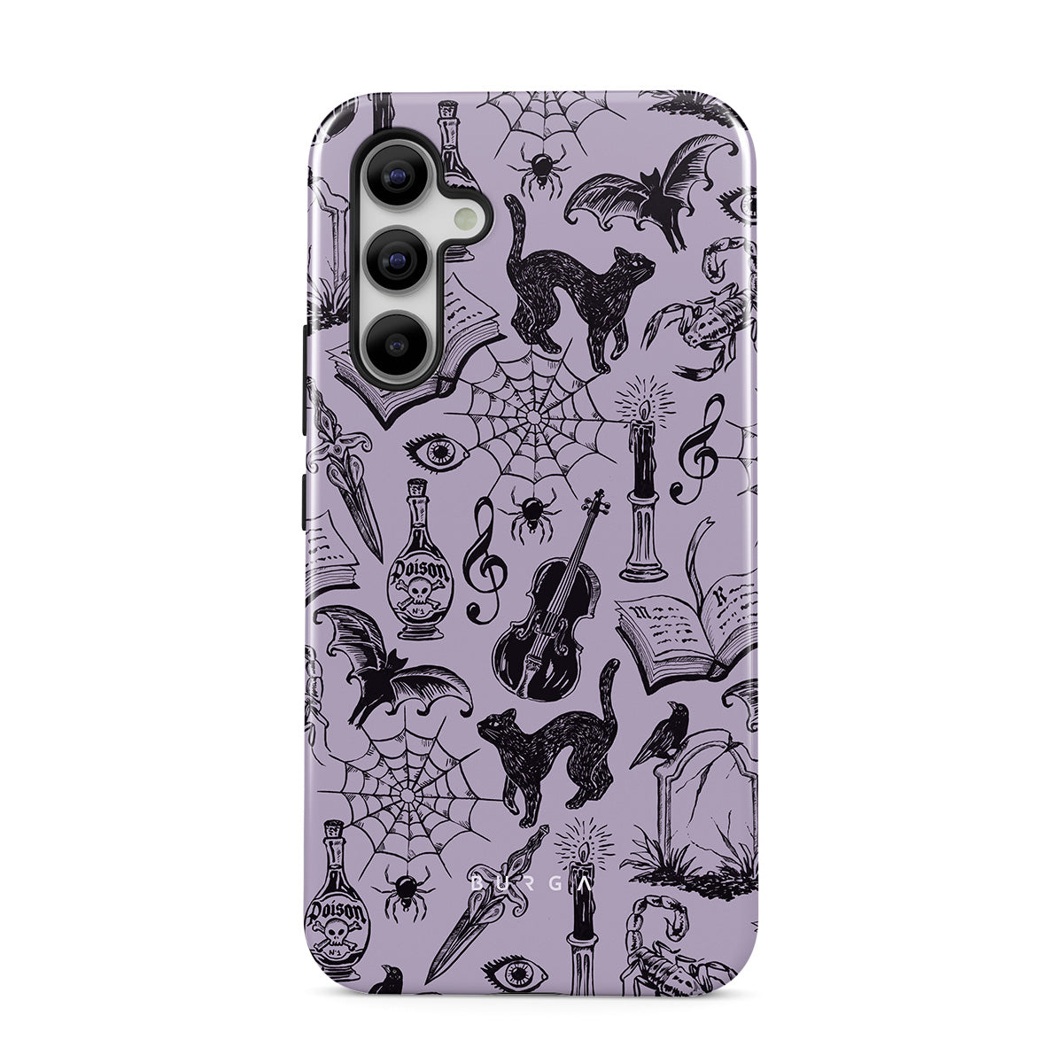 This design features: gothic doodles, mystical elements, spiders, spiderweb, cat, violin, eye, candle, dagger, book, bat, crow, scorpion