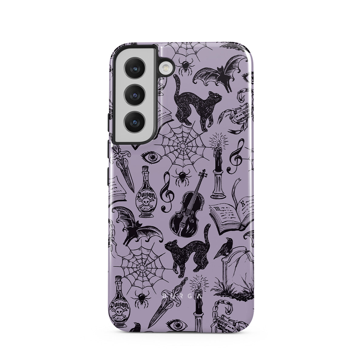 This design features: gothic doodles, mystical elements, spiders, spiderweb, cat, violin, eye, candle, dagger, book, bat, crow, scorpion