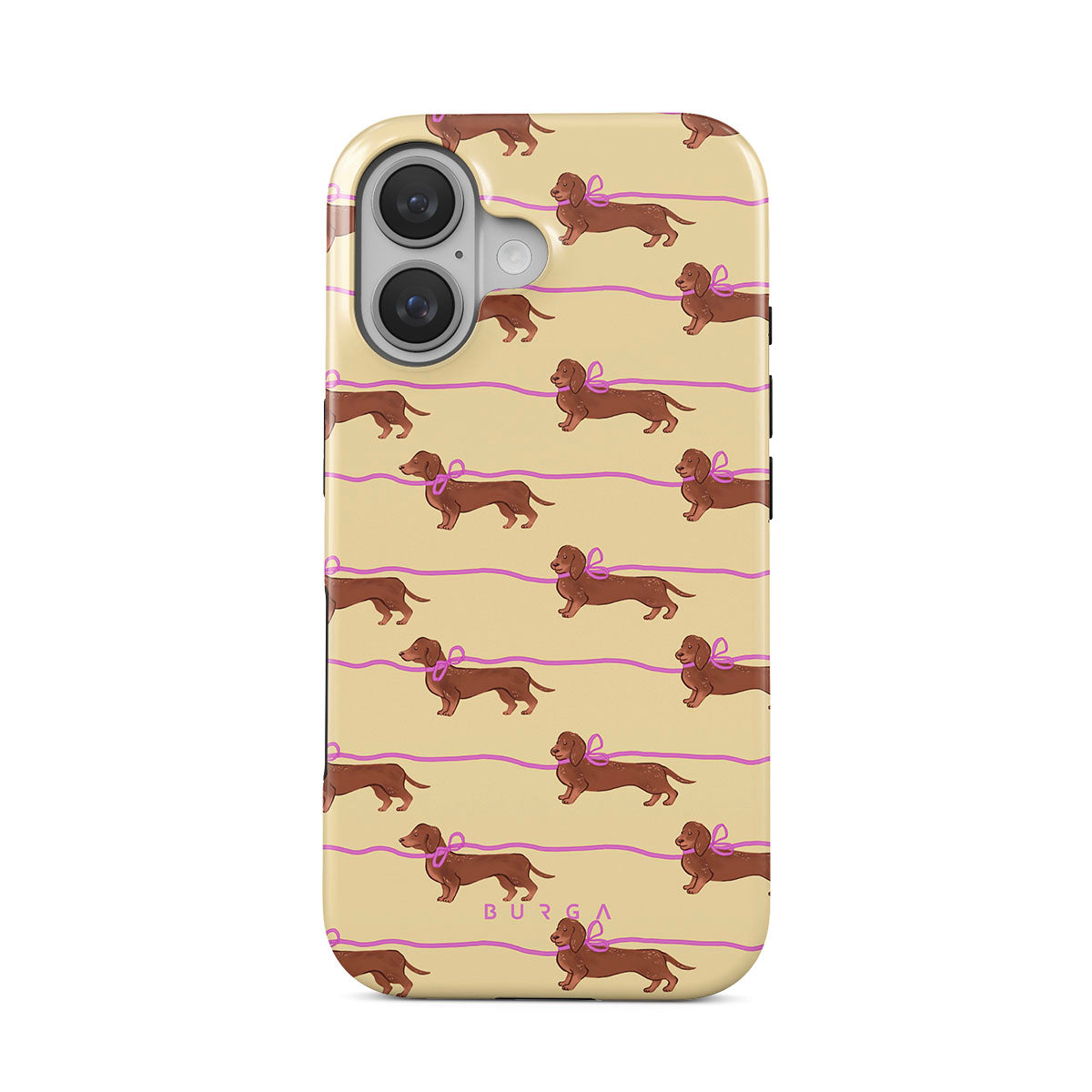 This iPhone 16 phone case design doesn’t believe in time, only vibes. It features sassy sausage dogs with bows who, like you, are running 15 minutes behind—and blaming Mercury.