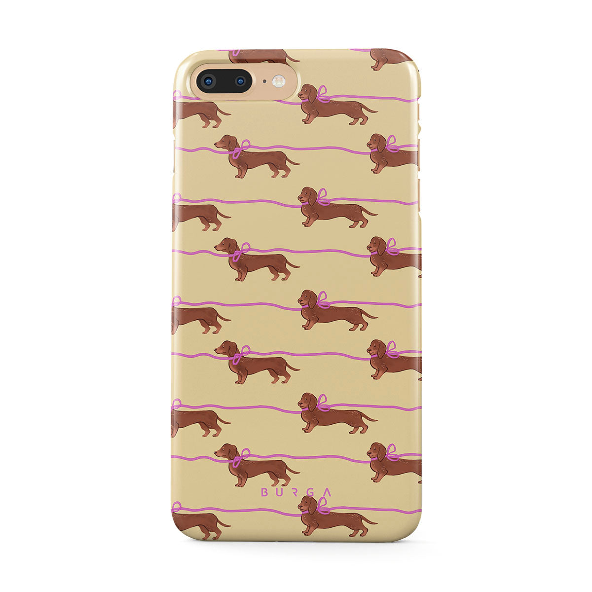 This iPhone 7 Plus / 8 Plus phone case design doesn’t believe in time, only vibes. It features sassy sausage dogs with bows who, like you, are running 15 minutes behind—and blaming Mercury.