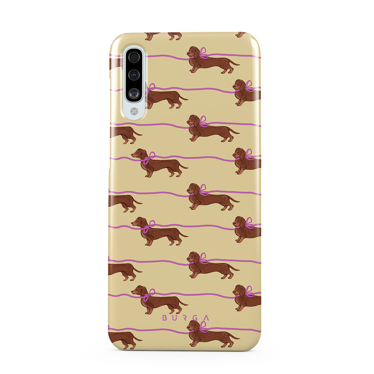 This Samsung Galaxy A50 phone case design doesn’t believe in time, only vibes. It features sassy sausage dogs with bows who, like you, are running 15 minutes behind—and blaming Mercury.