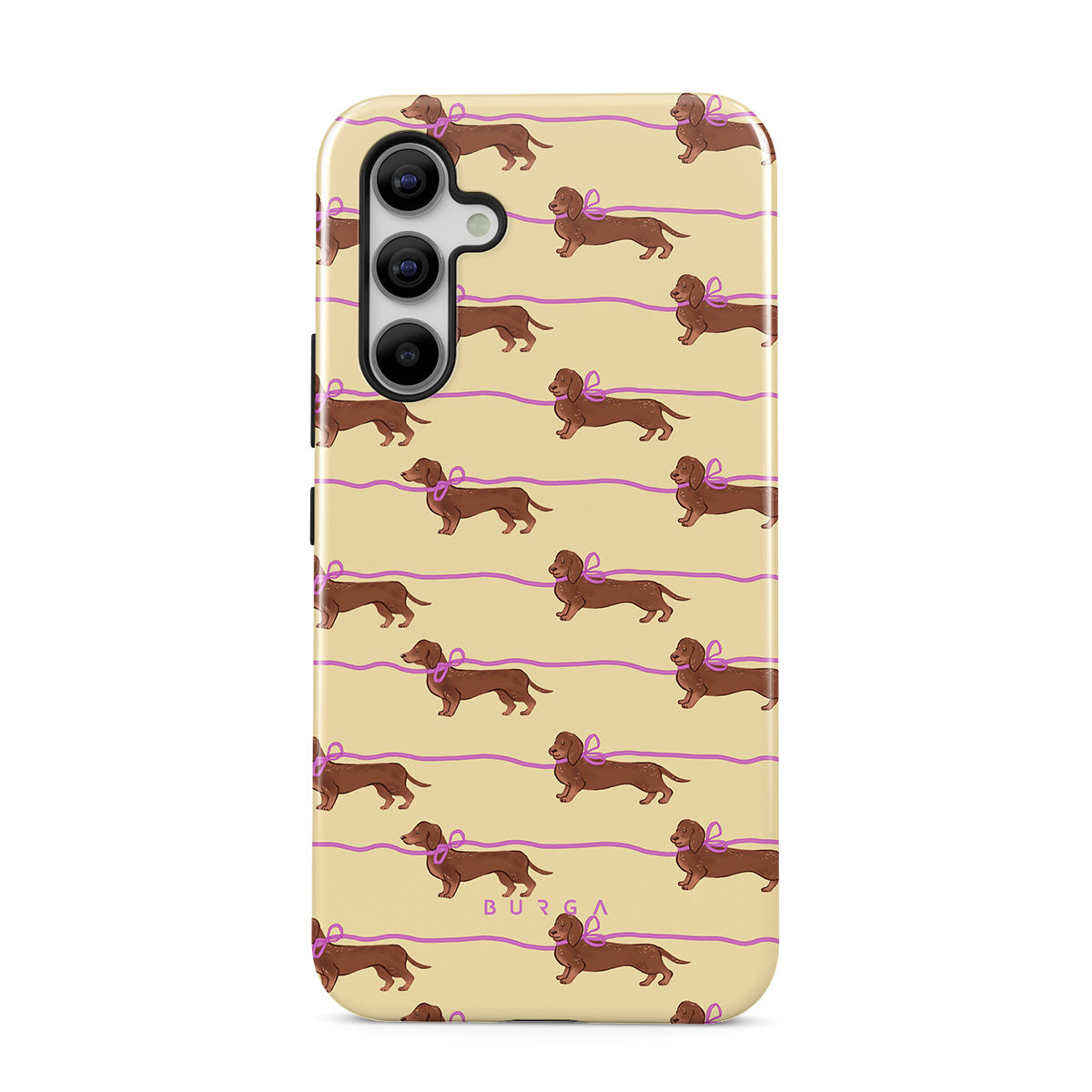 This Samsung Galaxy A54 phone case design doesn’t believe in time, only vibes. It features sassy sausage dogs with bows who, like you, are running 15 minutes behind—and blaming Mercury.