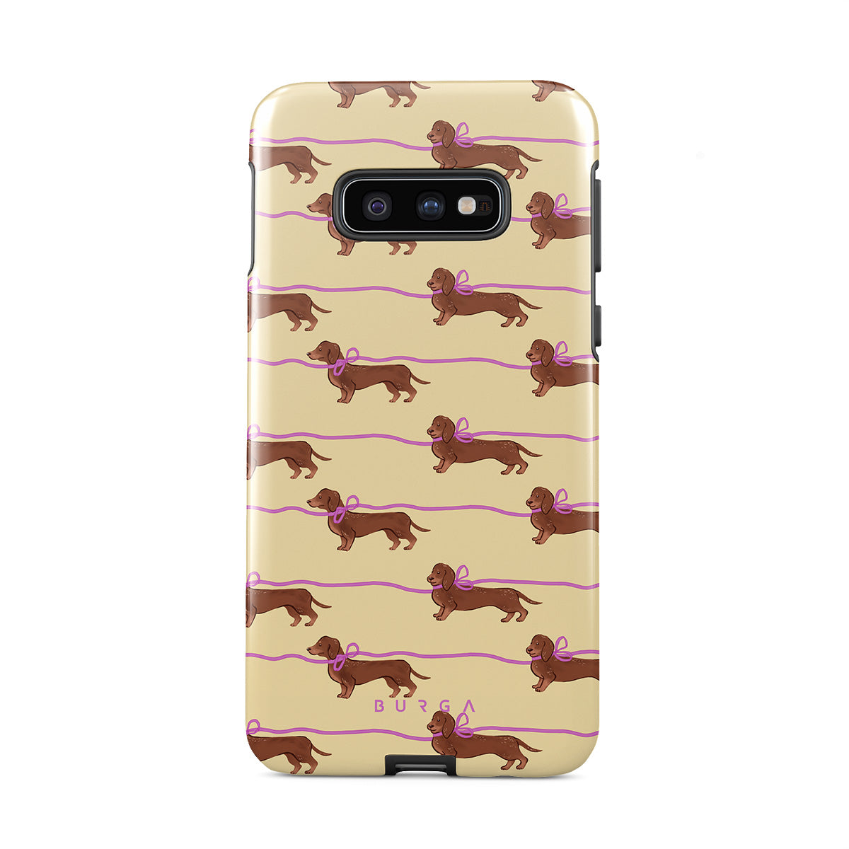 This Samsung Galaxy S10E phone case design doesn’t believe in time, only vibes. It features sassy sausage dogs with bows who, like you, are running 15 minutes behind—and blaming Mercury.