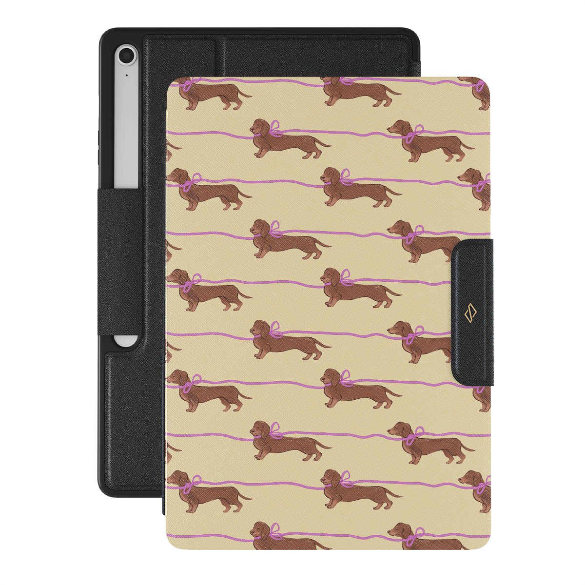 This Samsung Galaxy Tab S10+ FE design doesn’t believe in time, only vibes. It features sassy sausage dogs with bows who, like you, are running 15 minutes behind—and blaming Mercury.