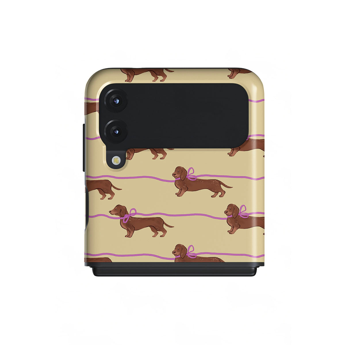 This Samsung Galaxy Z Flip 3 phone case design doesn’t believe in time, only vibes. It features sassy sausage dogs with bows who, like you, are running 15 minutes behind—and blaming Mercury.