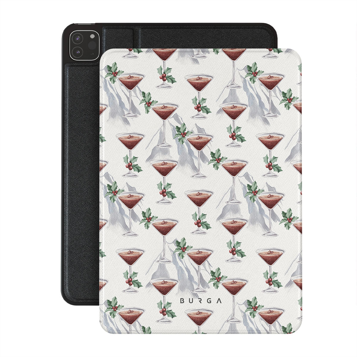 This design features: cocktail glasses, martinis, holly leaves