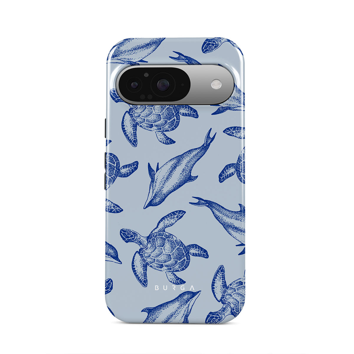 A beautiful design featuring lively turtles and dolphins playfully dancing in serene light blue water. Dive into the ocean's rhythm with our Aquatic Dance Google Pixel 9 Case.