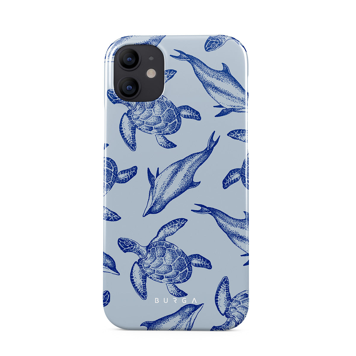 A beautiful design featuring lively turtles and dolphins playfully dancing in serene light blue water. Dive into the ocean's rhythm with our Aquatic Dance iPhone 12 Mini case.