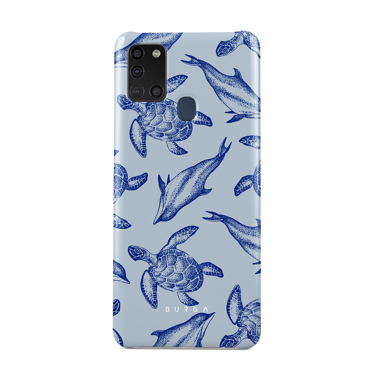 A beautiful design featuring lively turtles and dolphins playfully dancing in serene light blue water. Dive into the ocean's rhythm with our Aquatic Dance Samsung Galaxy A21s 4G case.