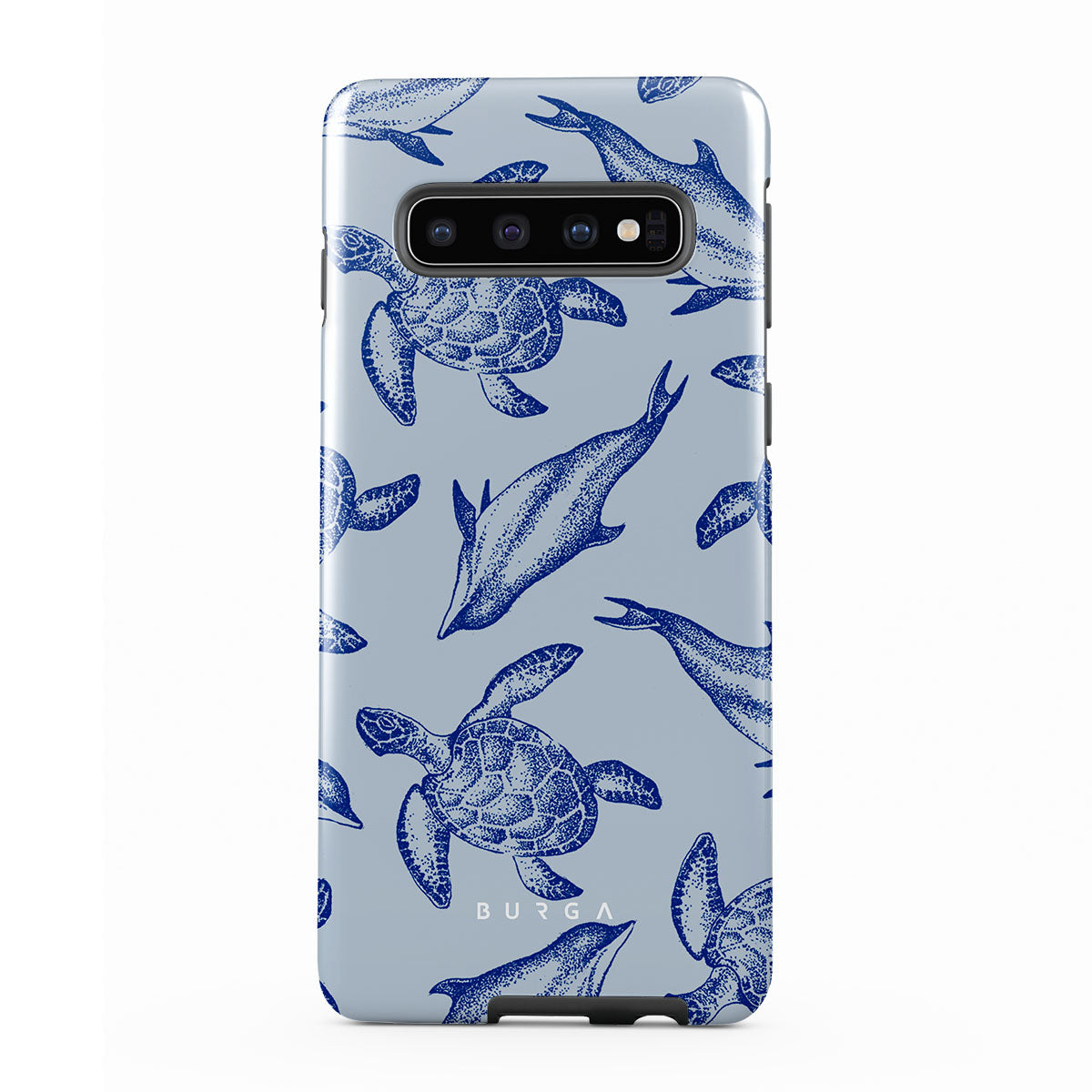 A beautiful design featuring lively turtles and dolphins playfully dancing in serene light blue water. Dive into the ocean's rhythm with our Aquatic Dance Samsung Galaxy S10 4G case.