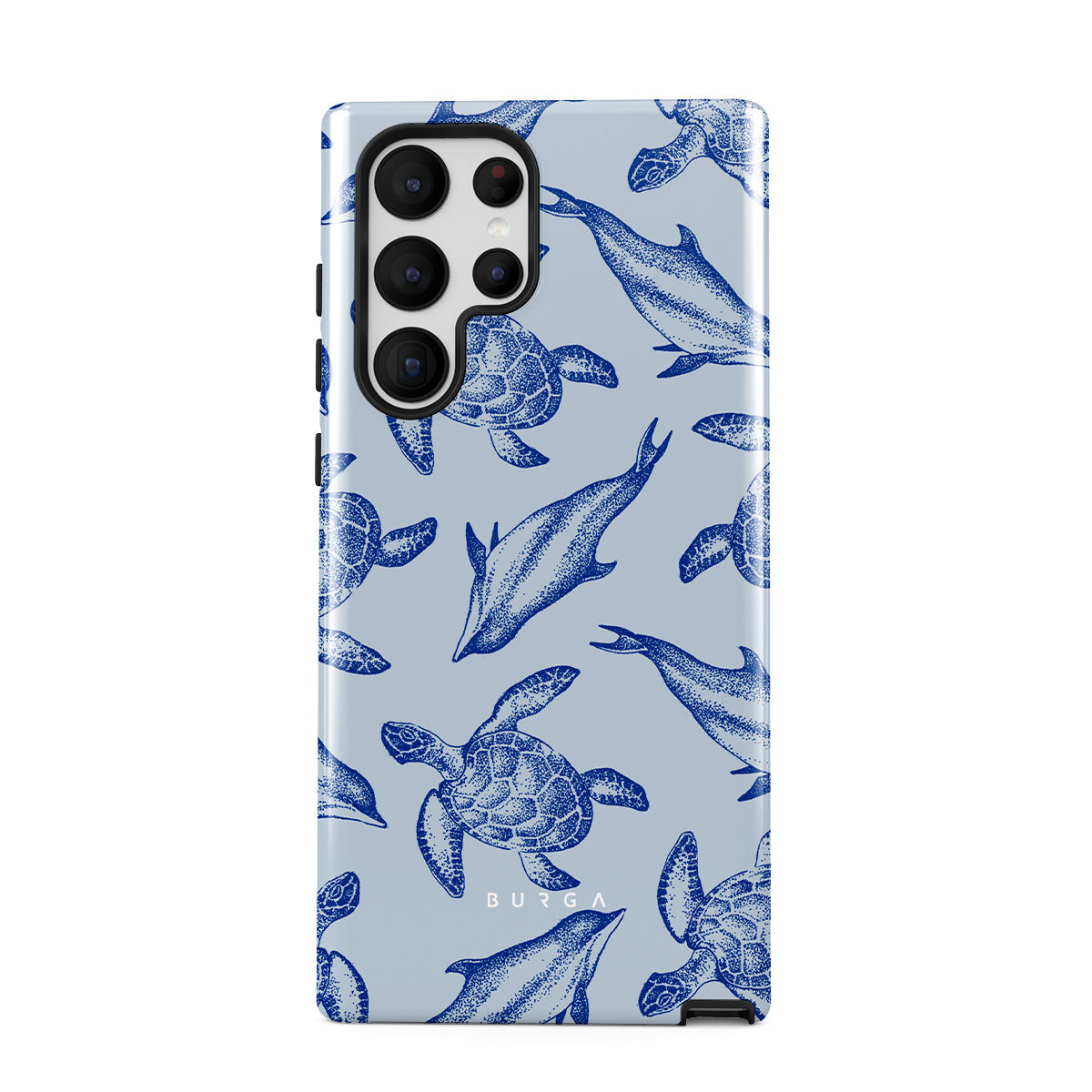 A beautiful design featuring lively turtles and dolphins playfully dancing in serene light blue water. Dive into the ocean's rhythm with our Aquatic Dance Samsung Galaxy S22 Ultra Case.