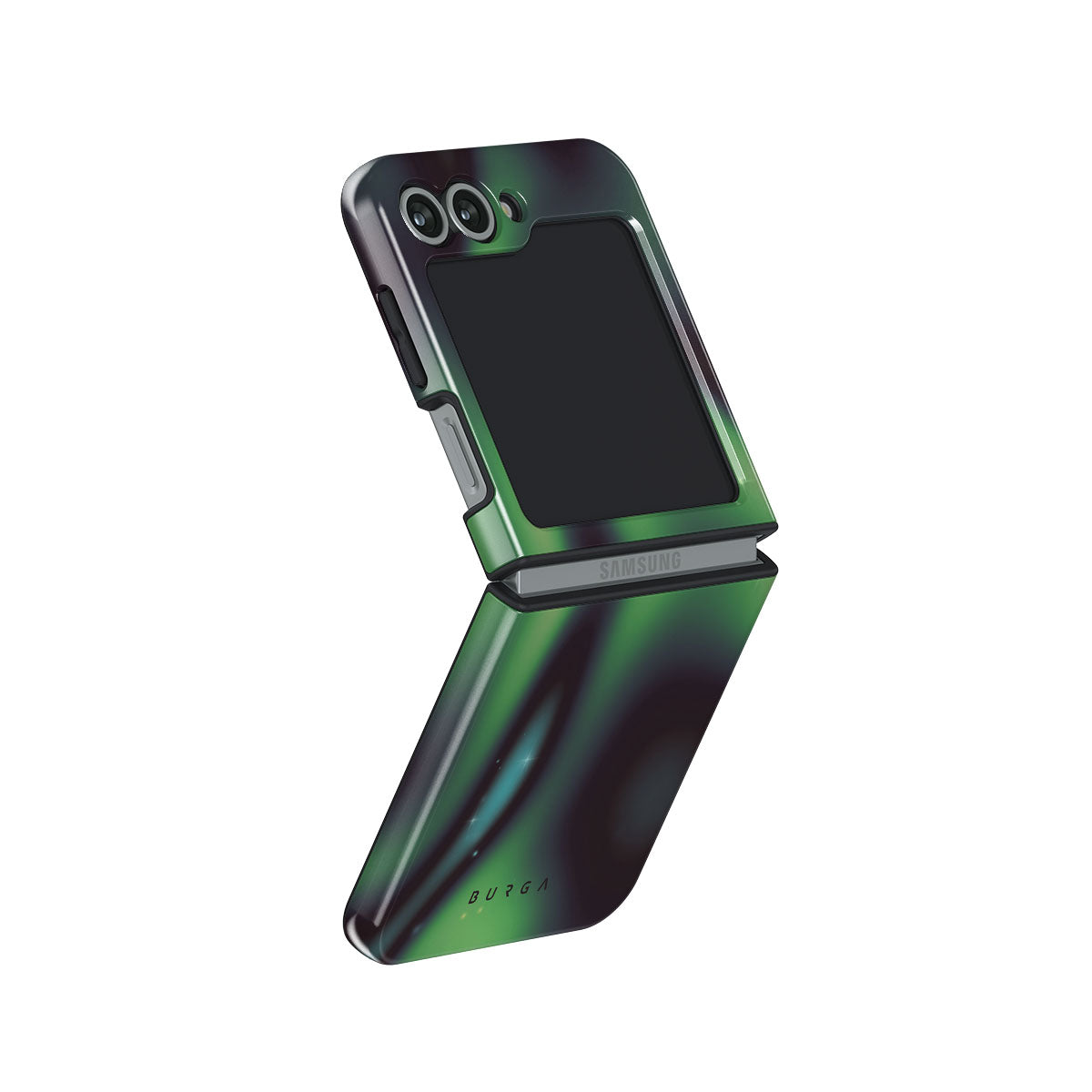 Nature's magic shines through in a mysterious display of lights. Delicate colors intertwine in a ballet of beauty and grace. Poetic harmony is captured with each swirl. It feels as if you're holding a piece of the night sky. Experience the serene grandeur of the Aurora Samsung Galaxy Z Flip 6 phone case design.