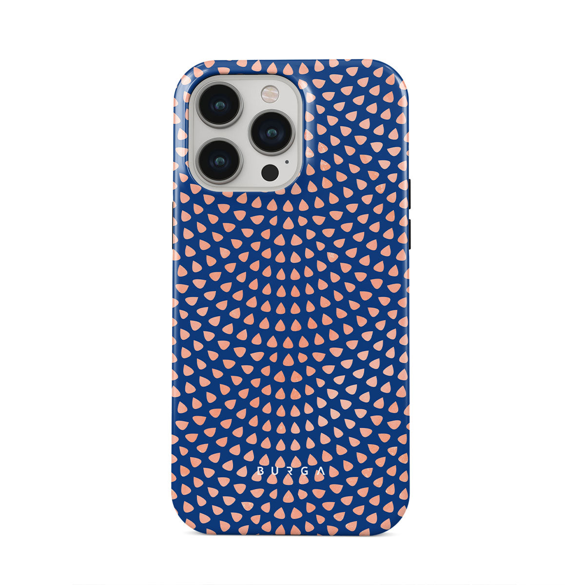 Rose gold teardrops meet a deep shade of blue in our Azure Waters iPhone 13 Pro phone case and create the duo worth taking with you every evening out. Add a touch of strictness with the symmetrical teardrops pattern paving the way and keeping your phone out of harm's way with the case that is as protective as it is beautiful.