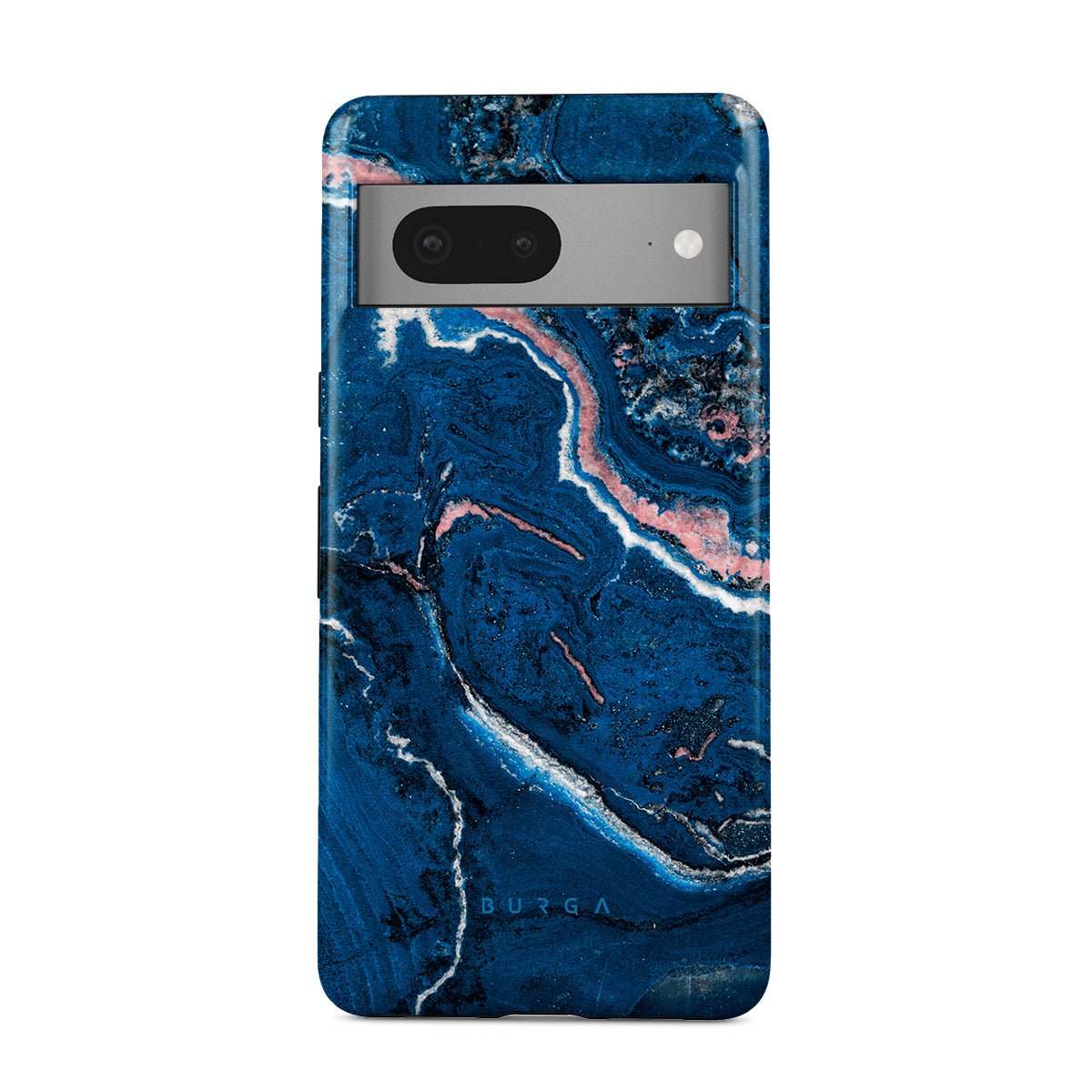 Electric indigo blue meets white, and pastel pink swirls in a unique marble pattern in our Blue Lagoon Google Pixel 7a phone case. The modern take on a blue marble trend will look aesthetically pleasing on your device while offering durable protection from any falls.
