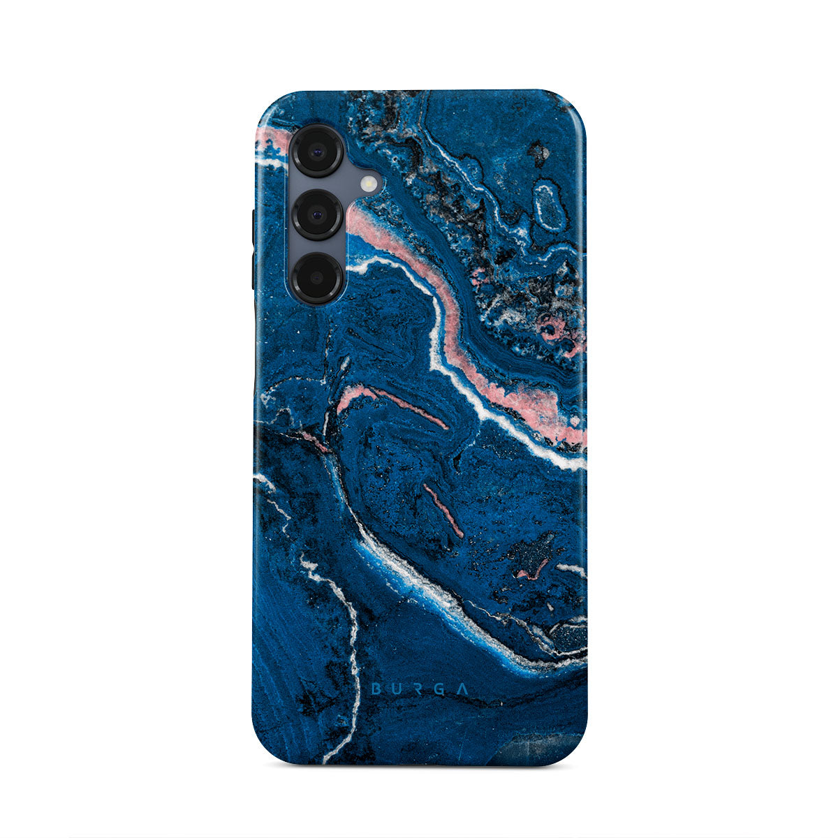 Electric indigo blue meets white, and pastel pink swirls in a unique marble pattern in our Blue Lagoon Samsung Galaxy A16 phone case. The modern take on a blue marble trend will look aesthetically pleasing on your device while offering durable protection from any falls.