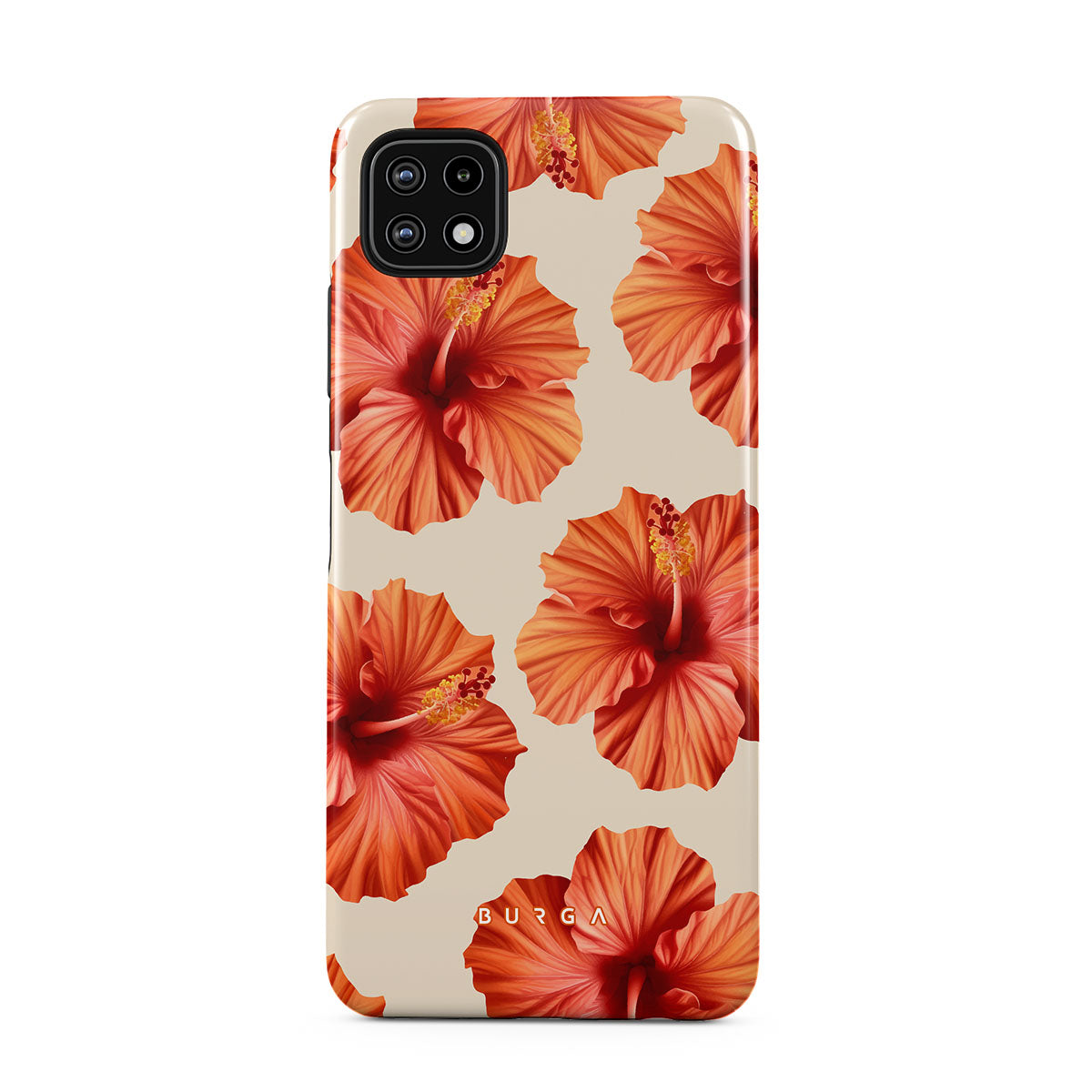 Transport yourself to a lush tropical escape with Bonita. Featuring bold, beautiful hibiscus blooms that pop against a creamy backdrop, this Samsung Galaxy A22 5G phone case design is perfect for those who dream of vibrant, floral beauty and exotic adventures.