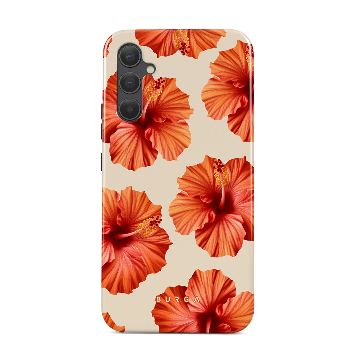 Transport yourself to a lush tropical escape with Bonita. Featuring bold, beautiful hibiscus blooms that pop against a creamy backdrop, this Samsung Galaxy A34 phone case design is perfect for those who dream of vibrant, floral beauty and exotic adventures.