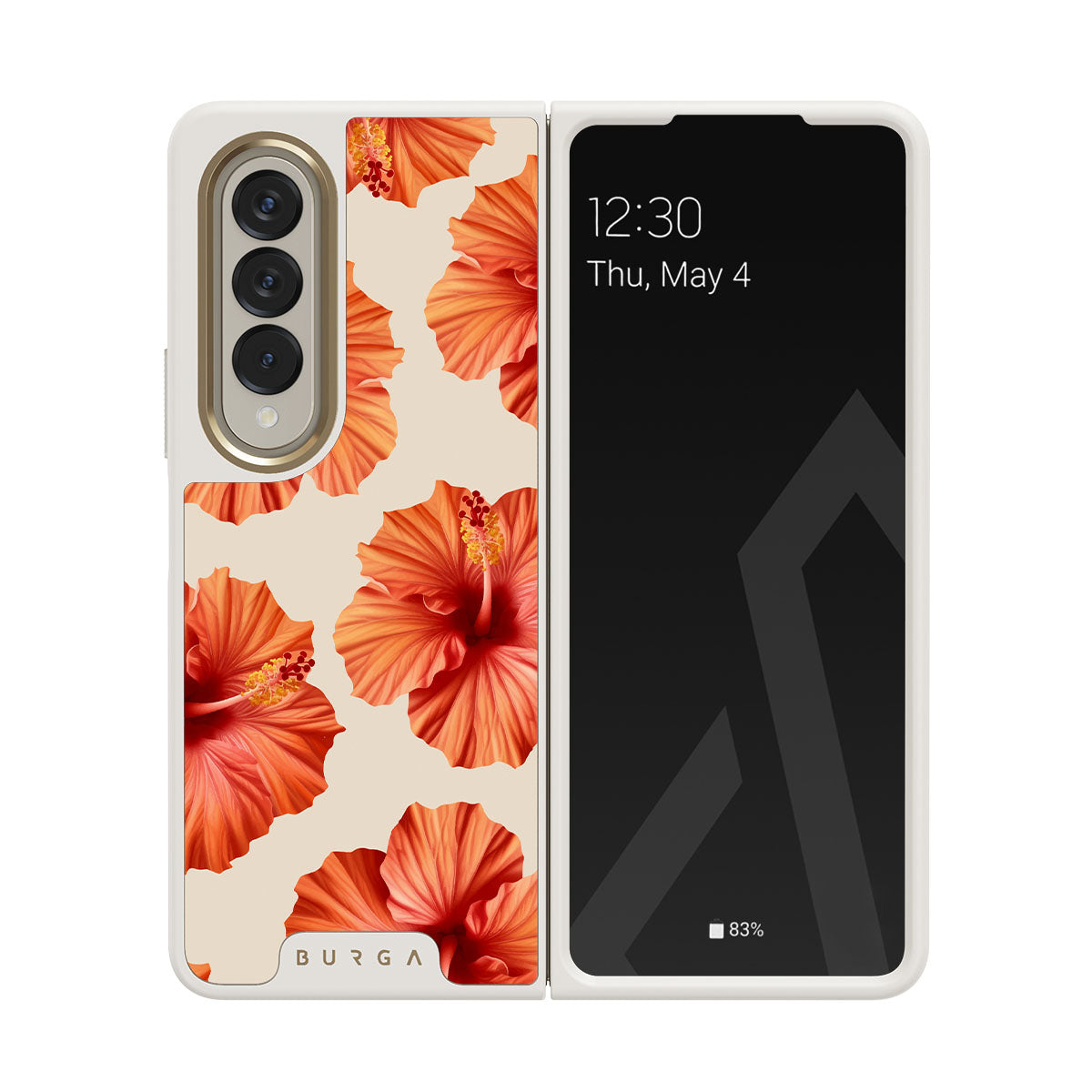 Transport yourself to a lush tropical escape with Bonita. Featuring bold, beautiful hibiscus blooms that pop against a creamy backdrop, this Samsung Galaxy Z Fold 4 phone case design is perfect for those who dream of vibrant, floral beauty and exotic adventures.
