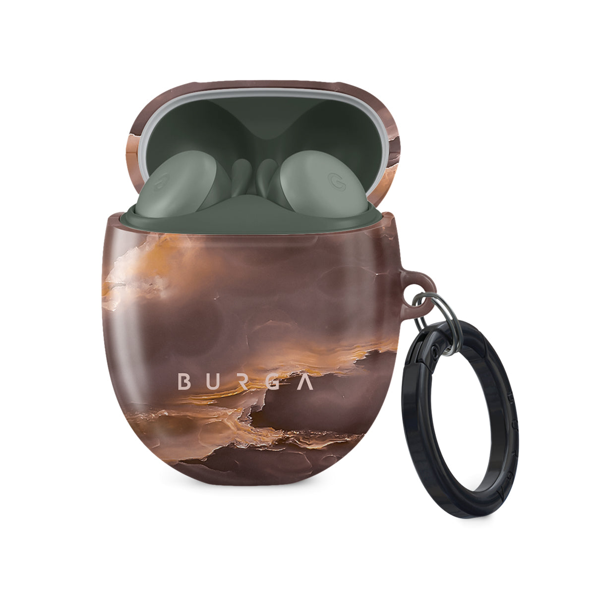 Our brown marble Google Pixel Buds A case cover was inspired by the warm evenings sitting by the bonfire. Being by the fire is an excellent way to relax, and keeping a stylish accessory by your side will allow you to keep such memory at a close reach while protecting y Our case from any damage. Our case fits perfectly snug around Google Pixel Buds A . “Like a glove!” one might say. And it won’t disrupt the wireless charging capabilities of the newer model. There’s even an LED light indicator to prove it (don’t worry, wired charging still works, too). When fitted, the BURGA case will protect the delicate Google Pixel Buds A case beneath it from scratches, bumps, and drops while remaining scratch-free itself. Our signature design pattern prints are High Quality, and will never peel or fade away- thanks to our unique printing technology. And finally, a handy carabiner is there to make your life easier and more convenient: just snap it around your keys or belt loop and tackle the day head-on. Your music is right there by your side when you need it.