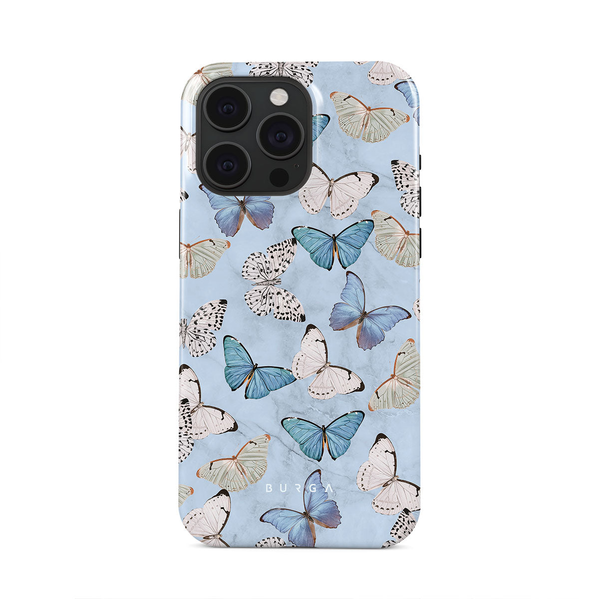 Pastel blue and a playful pattern of summery butterflies create a dreamy combination in our iPhone 15 Pro phone case. Carry the feeling of the butterflies in your stomach while protecting your phone from any dangers, as the hard-shell case will keep it sound and safe.