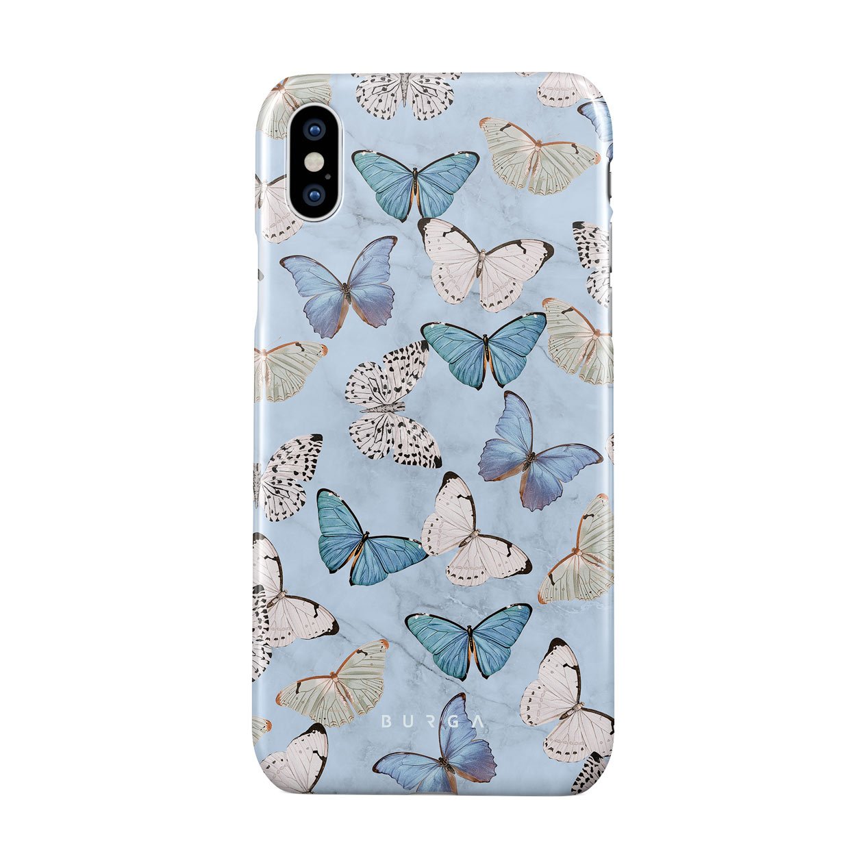 Pastel blue and a playful pattern of summery butterflies create a dreamy combination in our iPhone X / XS phone case. Carry the feeling of the butterflies in your stomach while protecting your phone from any dangers, as the hard-shell case will keep it sound and safe.