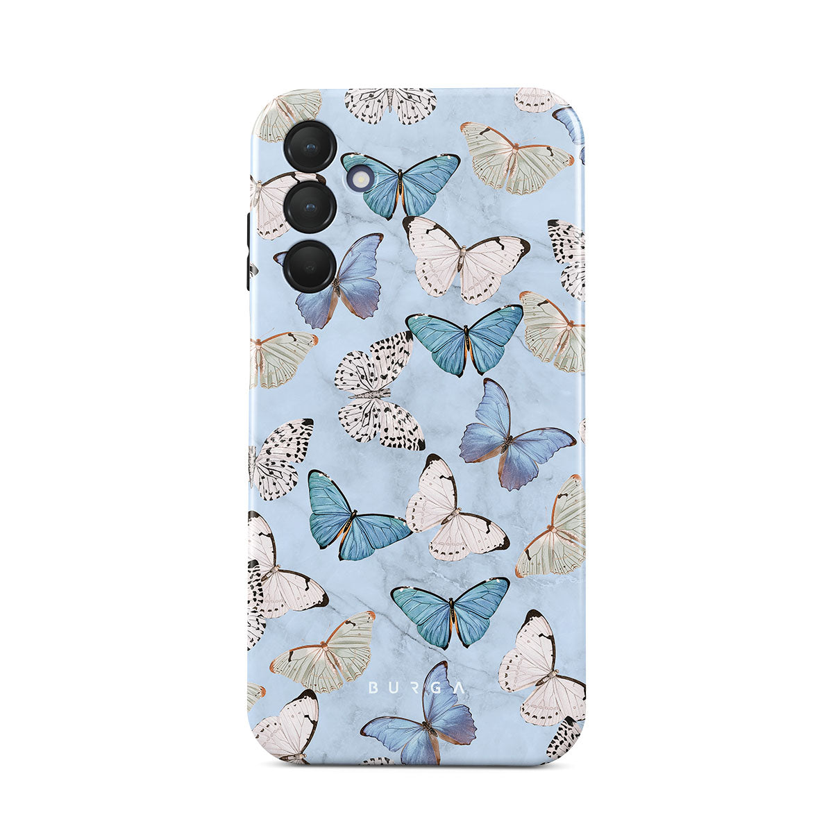 Pastel blue and a playful pattern of summery butterflies create a dreamy combination in our Samsung Galaxy A51 phone case. Carry the feeling of the butterflies in your stomach while protecting your phone from any dangers, as the hard-shell case will keep it sound and safe.
