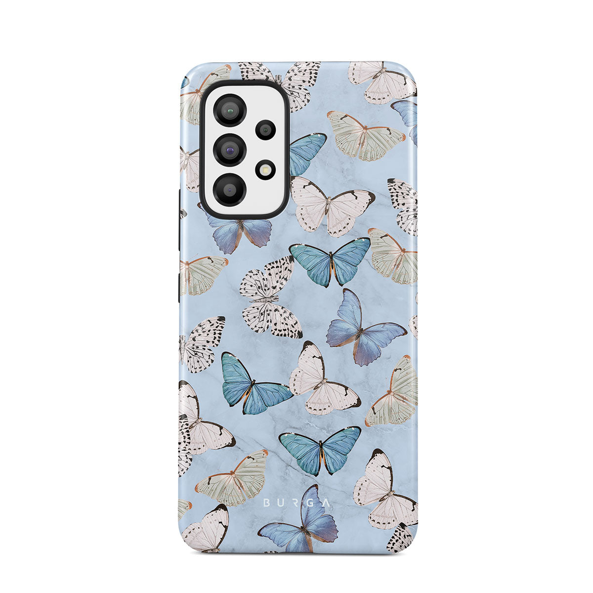 Pastel blue and a playful pattern of summery butterflies create a dreamy combination in our Samsung Galaxy A33 phone case. Carry the feeling of the butterflies in your stomach while protecting your phone from any dangers, as the hard-shell case will keep it sound and safe.