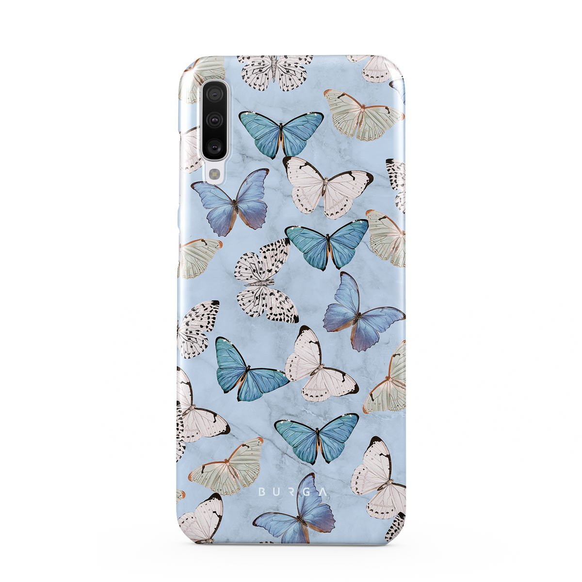 Pastel blue and a playful pattern of summery butterflies create a dreamy combination in our Samsung Galaxy A70 phone case. Carry the feeling of the butterflies in your stomach while protecting your phone from any dangers, as the hard-shell case will keep it sound and safe.