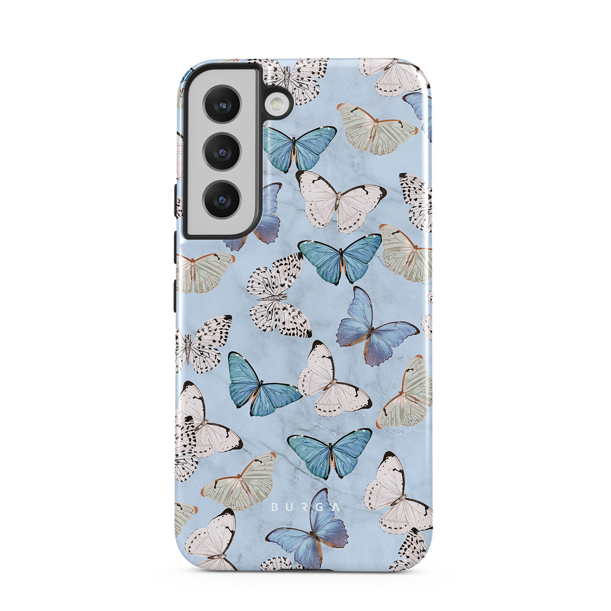 Pastel blue and a playful pattern of summery butterflies create a dreamy combination in our Samsung Galaxy S22 phone case. Carry the feeling of the butterflies in your stomach while protecting your phone from any dangers, as the hard-shell case will keep it sound and safe.