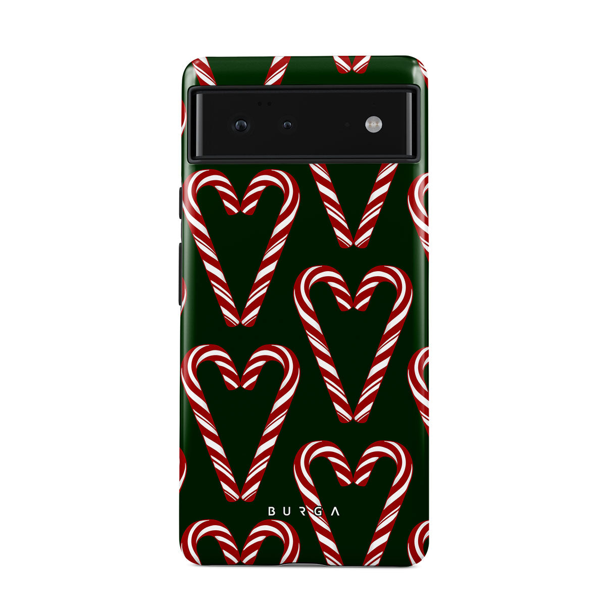 Vibrant and playful, our Candy Cane Google Pixel 6 Pro Case phone case design showcases candy cane heart motifs against a dark green background—a delightful choice for those who love a touch of whimsy and nostalgia.
