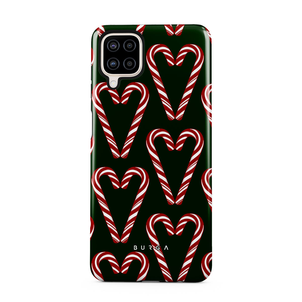 Vibrant and playful, our Candy Cane Samsung Galaxy A12 4G Case phone case design showcases candy cane heart motifs against a dark green background—a delightful choice for those who love a touch of whimsy and nostalgia.