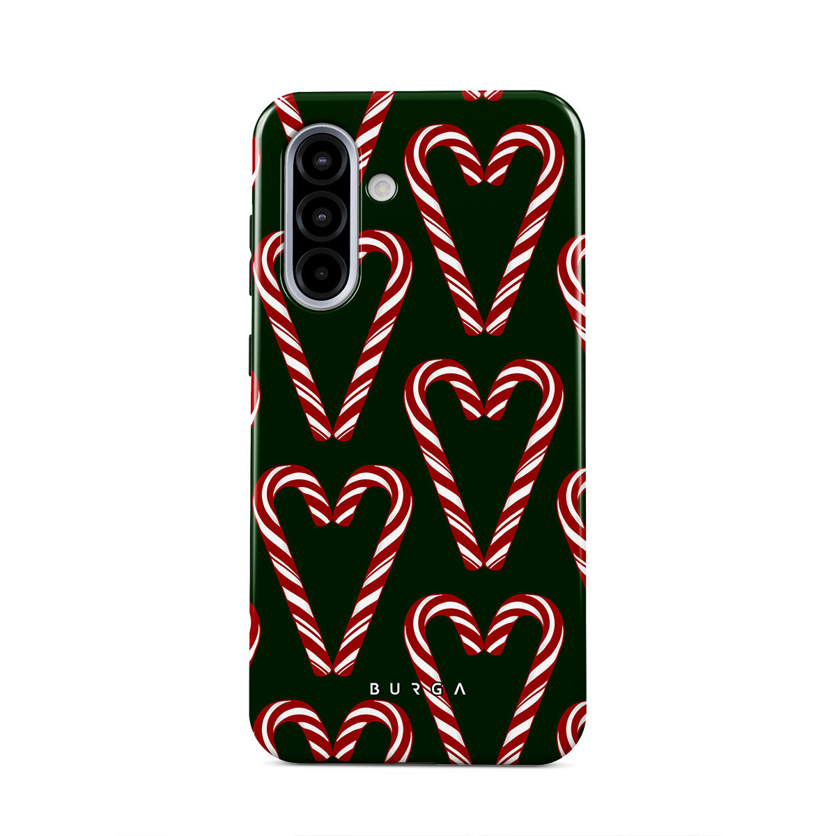 Vibrant and playful, our Candy Cane Samsung Galaxy A56 5G Case phone case design showcases candy cane heart motifs against a dark green background—a delightful choice for those who love a touch of whimsy and nostalgia.