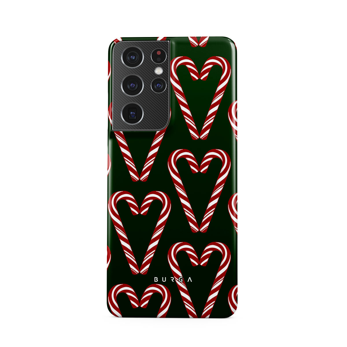 Vibrant and playful, our Candy Cane Samsung Galaxy S21 Ultra Case phone case design showcases candy cane heart motifs against a dark green background—a delightful choice for those who love a touch of whimsy and nostalgia.