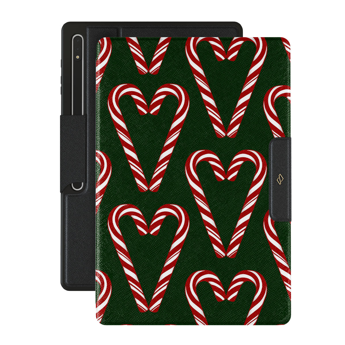 Vibrant and playful, our Candy Cane Samsung Galaxy Tab S8 Ultra folio case design showcases candy cane heart motifs against a dark green background—a delightful choice for those who love a touch of whimsy and nostalgia.