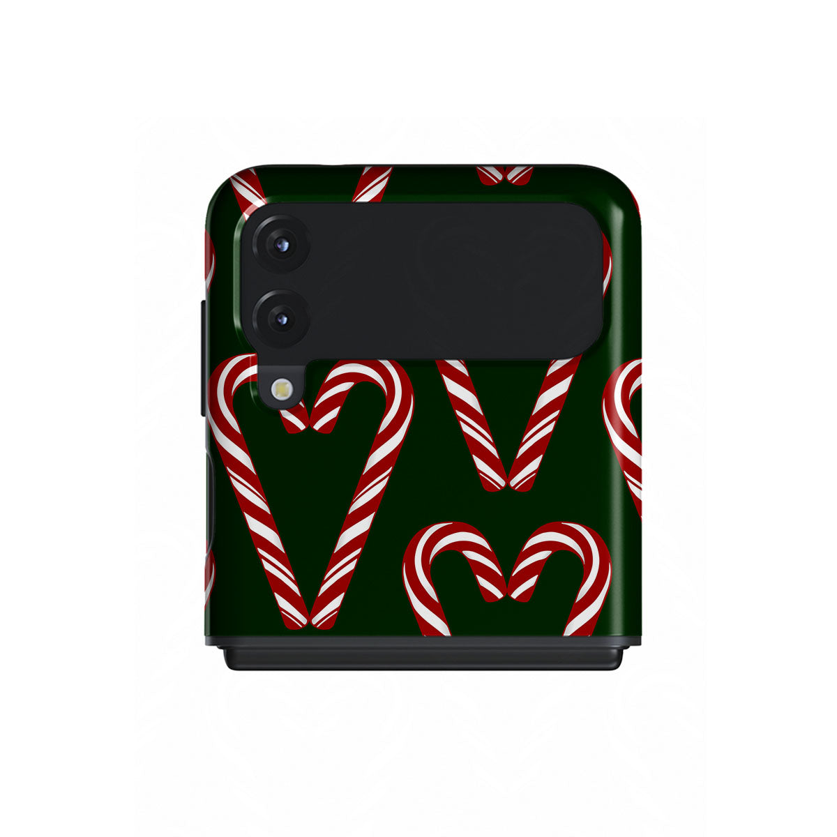 Vibrant and playful, our Candy Cane Samsung Galaxy Z Flip 3 Case phone case design showcases candy cane heart motifs against a dark green background—a delightful choice for those who love a touch of whimsy and nostalgia.