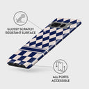 Embrace the essence of subtle luxury with our Check & Mate Google Pixel 7 Pro phone case design. Blending eggshell and deep blue checkers, it evokes whispers of elegance. While diamonds grace the upper half, the lower half features a timeless chessboard pattern.