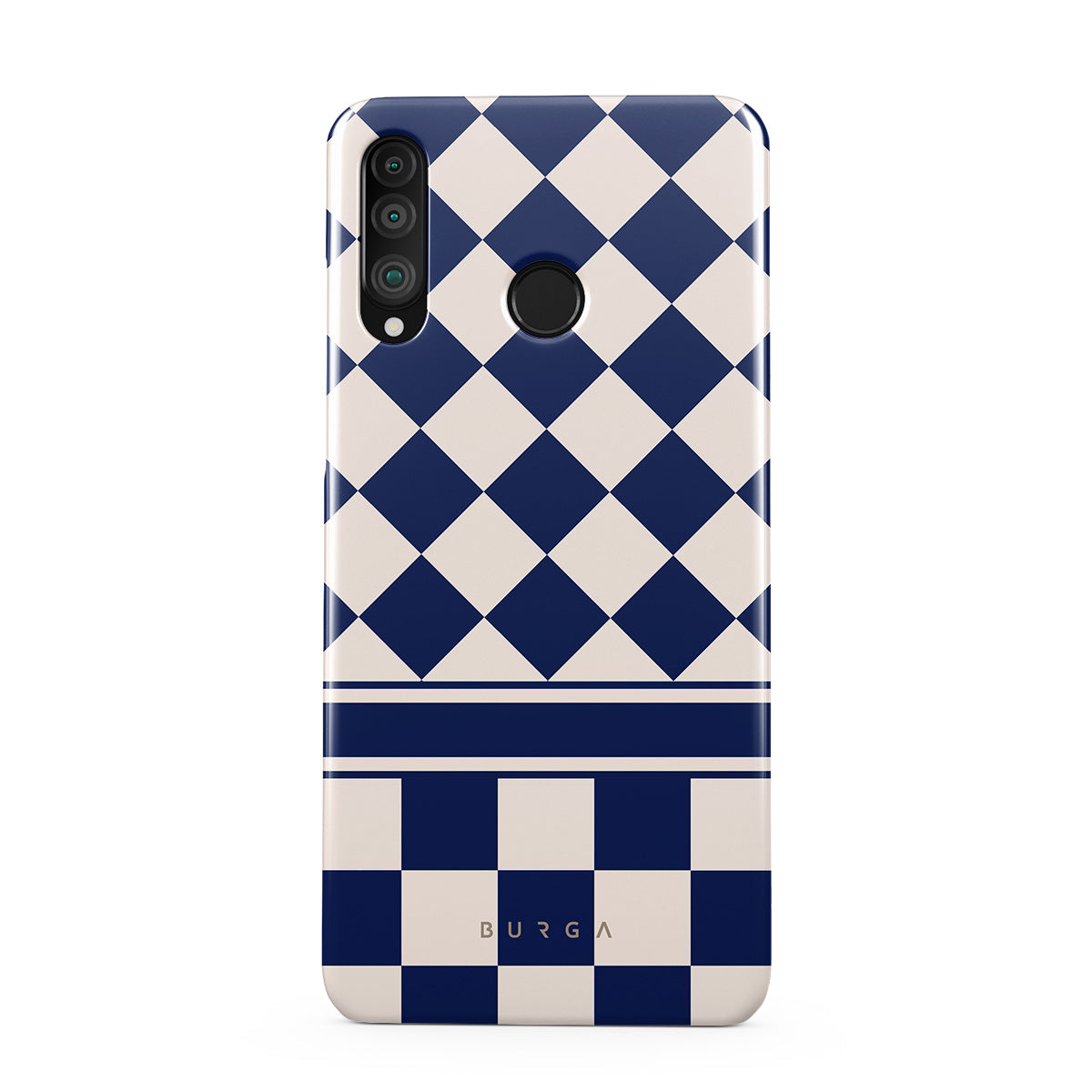 Embrace the essence of subtle luxury with our Check & Mate Huawei P30 Lite phone case design. Blending eggshell and deep blue checkers, it evokes whispers of elegance. While diamonds grace the upper half, the lower half features a timeless chessboard pattern.