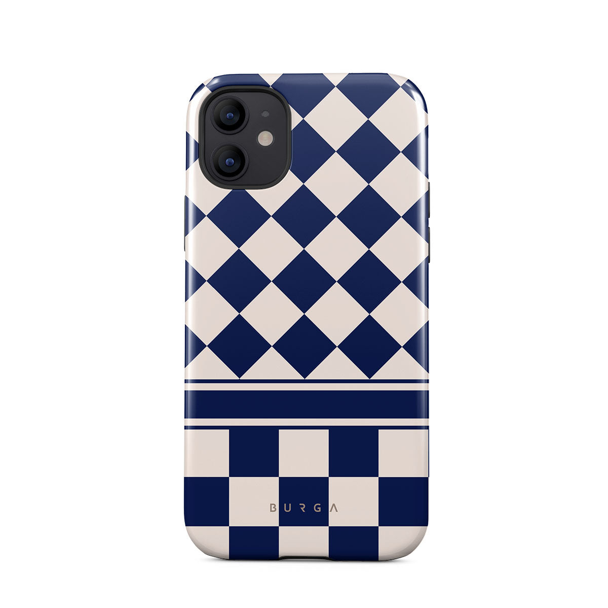Embrace the essence of subtle luxury with our Check & Mate iPhone 12 phone case design. Blending eggshell and deep blue checkers, it evokes whispers of elegance. While diamonds grace the upper half, the lower half features a timeless chessboard pattern.