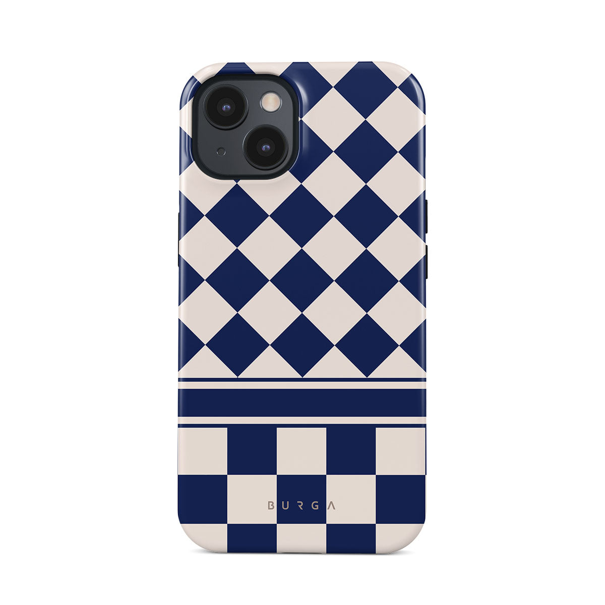 Embrace the essence of subtle luxury with our Check & Mate iPhone 13 Mini phone case design. Blending eggshell and deep blue checkers, it evokes whispers of elegance. While diamonds grace the upper half, the lower half features a timeless chessboard pattern.
