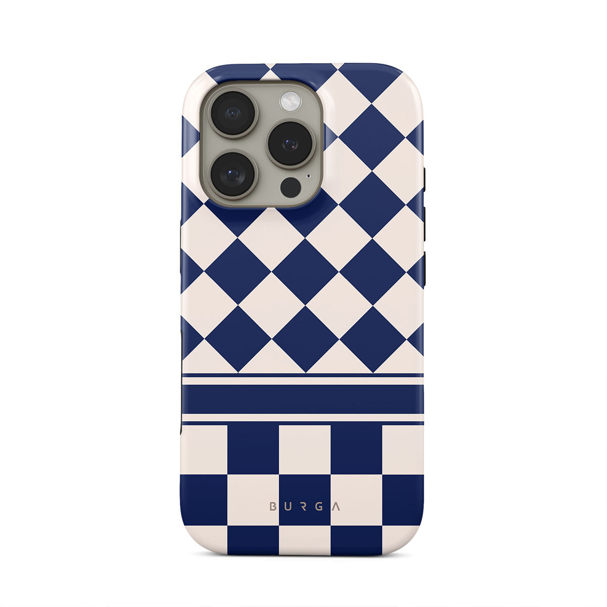 Embrace the essence of subtle luxury with our Check & Mate iPhone 16 Pro Max phone case design. Blending eggshell and deep blue checkers, it evokes whispers of elegance. While diamonds grace the upper half, the lower half features a timeless chessboard pattern.