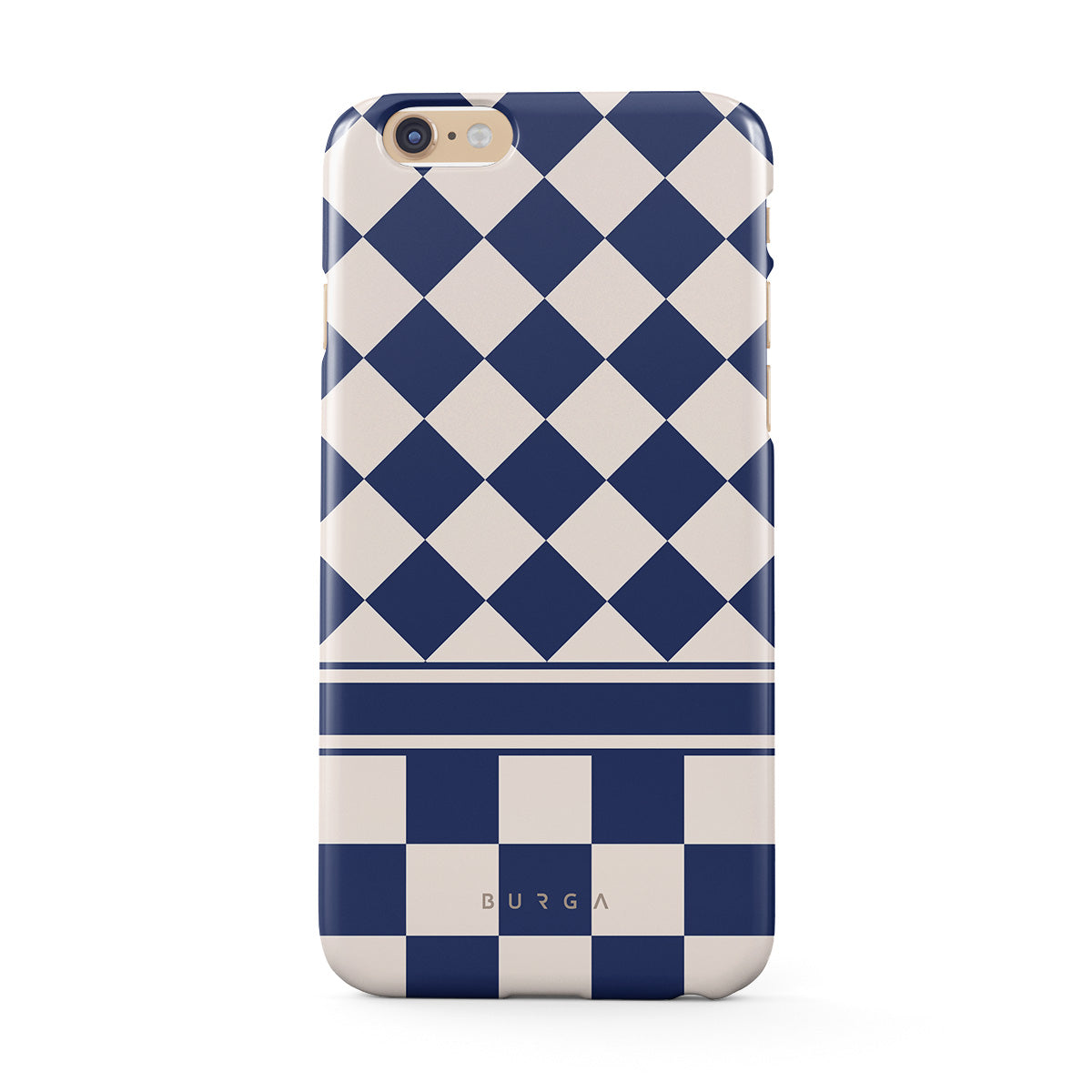 Embrace the essence of subtle luxury with our Check & Mate iPhone 6 / 6S phone case design. Blending eggshell and deep blue checkers, it evokes whispers of elegance. While diamonds grace the upper half, the lower half features a timeless chessboard pattern.