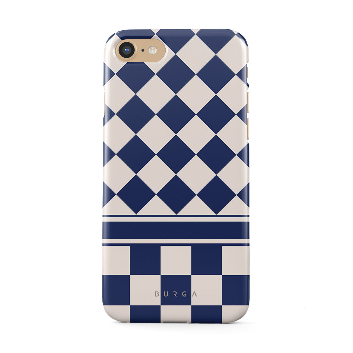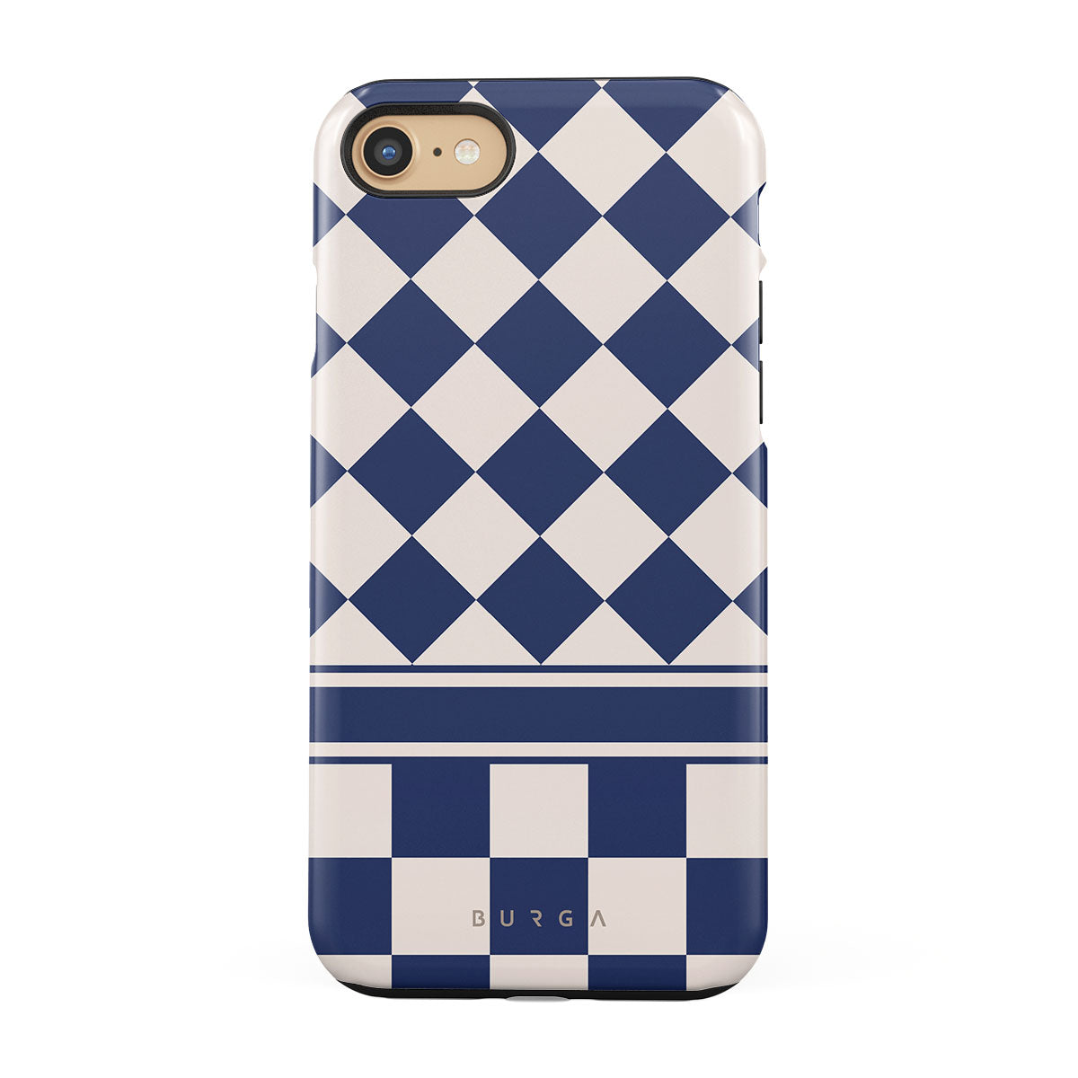 Embrace the essence of subtle luxury with our Check & Mate iPhone SE (2022) phone case design. Blending eggshell and deep blue checkers, it evokes whispers of elegance. While diamonds grace the upper half, the lower half features a timeless chessboard pattern.