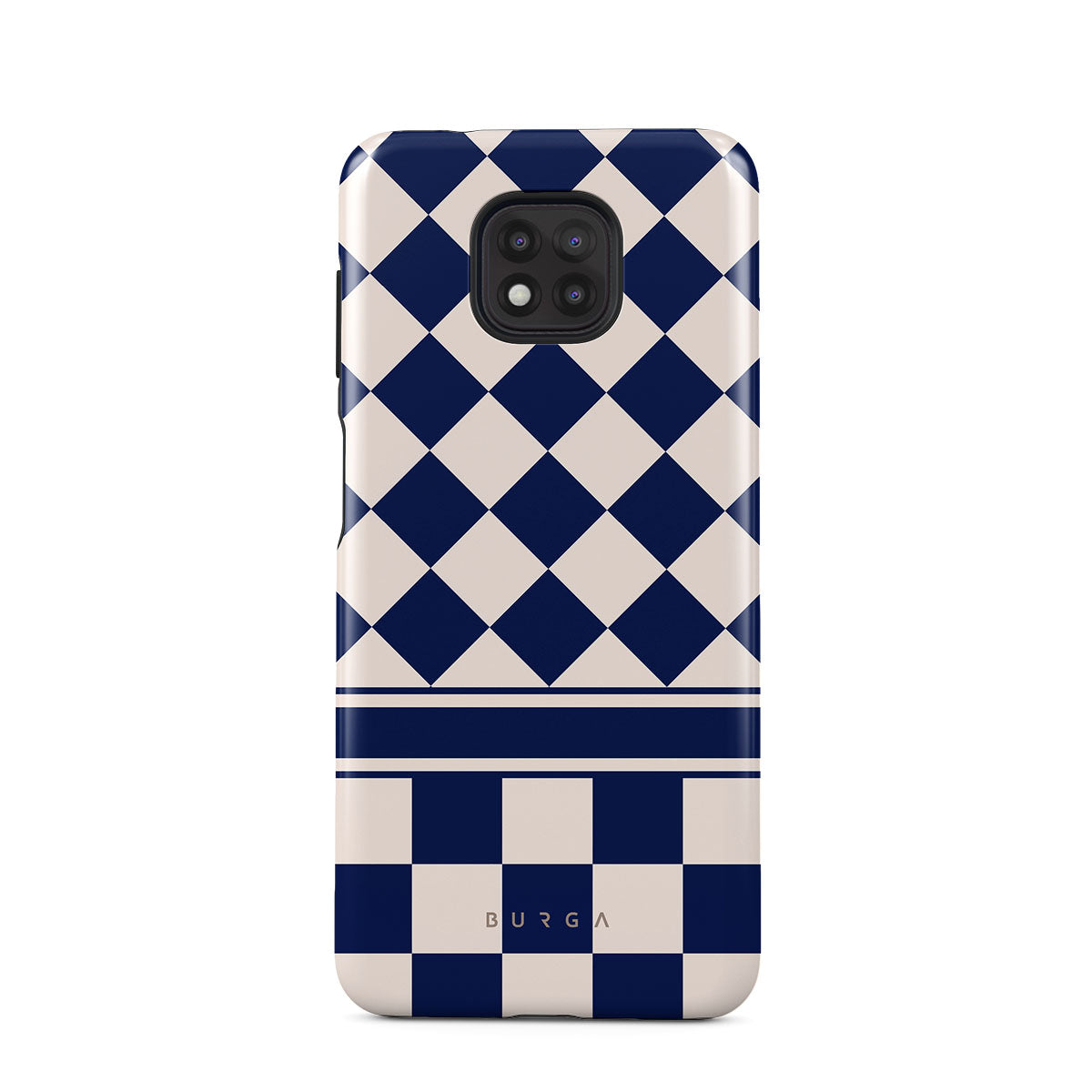 Embrace the essence of subtle luxury with our Check & Mate Motorola Moto G Power 2021 phone case design. Blending eggshell and deep blue checkers, it evokes whispers of elegance. While diamonds grace the upper half, the lower half features a timeless chessboard pattern.