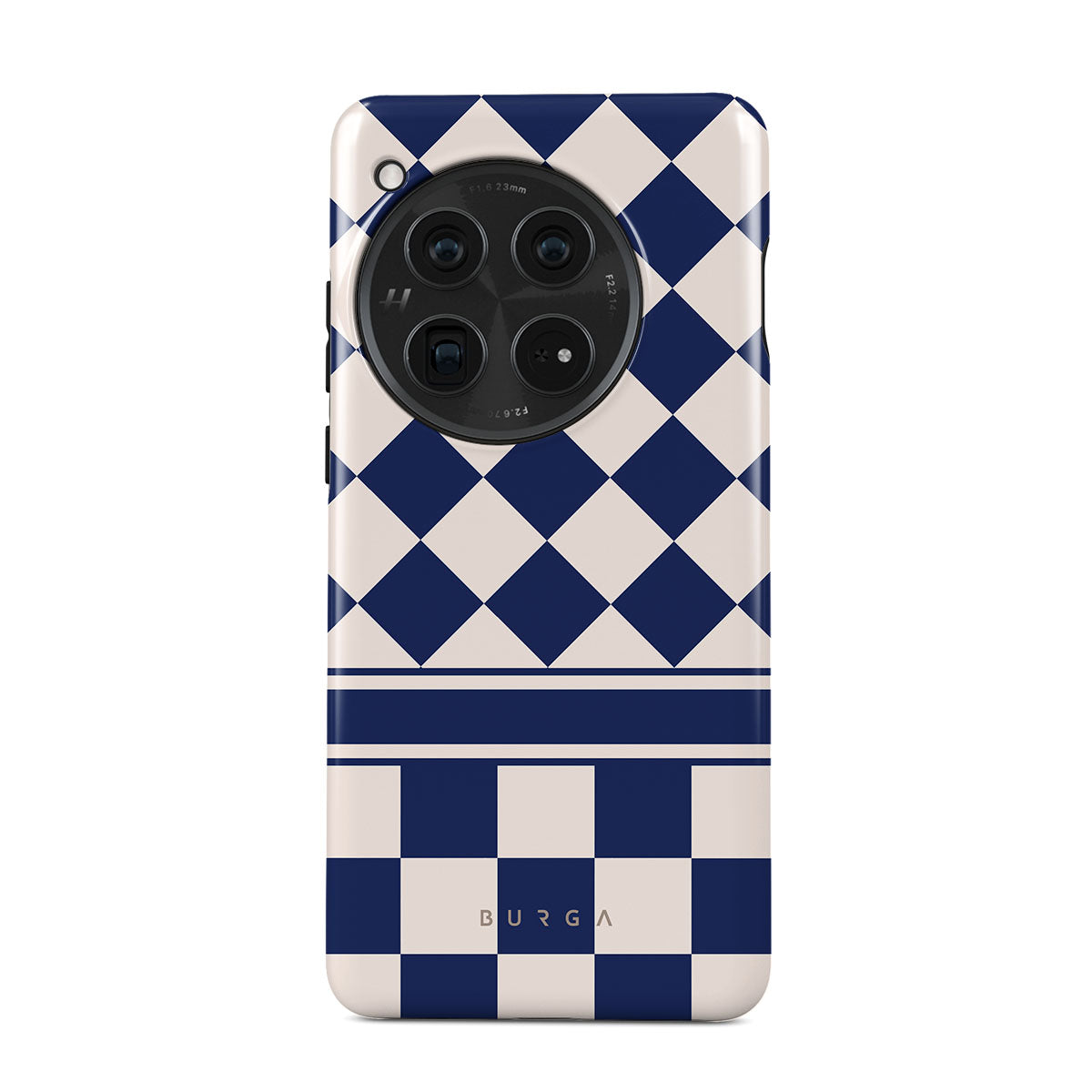 Embrace the essence of subtle luxury with our Check & Mate OnePlus 12 phone case design. Blending eggshell and deep blue checkers, it evokes whispers of elegance. While diamonds grace the upper half, the lower half features a timeless chessboard pattern.