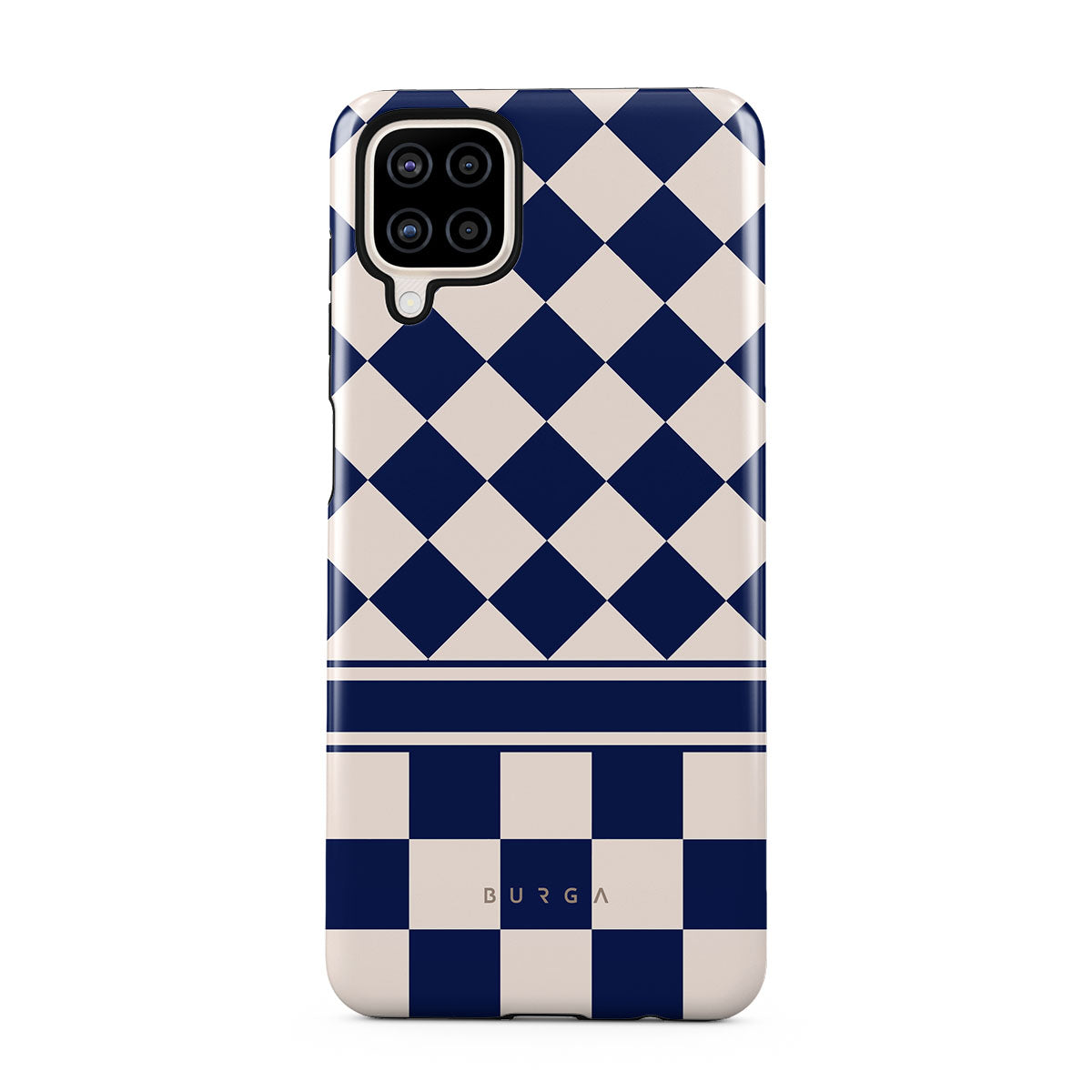 Embrace the essence of subtle luxury with our Check & Mate Samsung Galaxy A12 4G phone case design. Blending eggshell and deep blue checkers, it evokes whispers of elegance. While diamonds grace the upper half, the lower half features a timeless chessboard pattern.