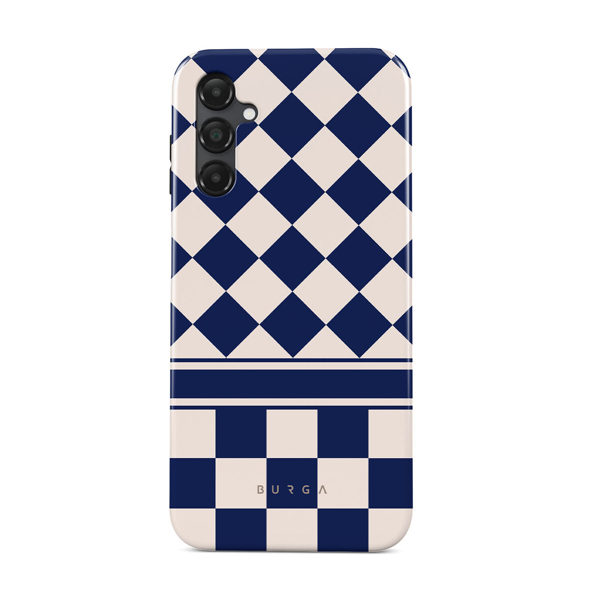 Embrace the essence of subtle luxury with our Check & Mate Samsung Galaxy A14 5G phone case design. Blending eggshell and deep blue checkers, it evokes whispers of elegance. While diamonds grace the upper half, the lower half features a timeless chessboard pattern.